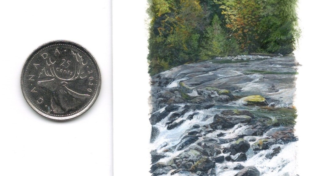 Here is another scene from the lovely Englishman River area near Parksville BC on Vancouver Island. This miniature painting is titled “Overlooking the Falls” and measures 5.25 x 1.5 inches and is painted with acrylic on art board. I’m including a photo with a coin to show scale.