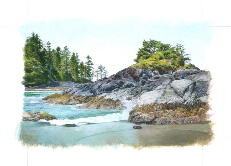 Step 5 November 7, 2021 1389 × 1002 Step 5 5. Now adding hundreds of tiny brush strokes to the water, seaweed and beach areas. Starting to shape the water’s edge and foamy bits.