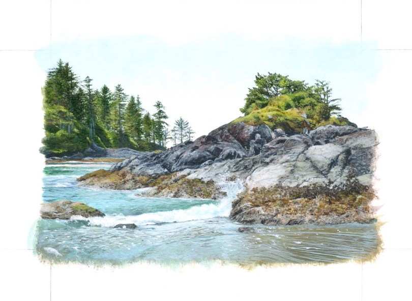 Step 6 November 7, 2021 1389 × 1016 Step 6 6. Developing the wet beach areas with fine lines, adding ripples and paying attention to reflected light and movement of the water in all areas.