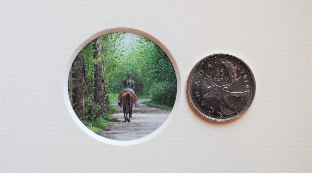 It takes me about 20 hours to complete an average image that measures 2 x 4 inches, using acrylic paint on paper board, with several tiny brushes and a generous amount of patience and concentration. I often hold my breath while applying the tiniest of details and frequently have to remind myself to get up and move around. As well as time spent on location, or in the studio, I enjoy teaching and sharing the art of painting in miniature with others.