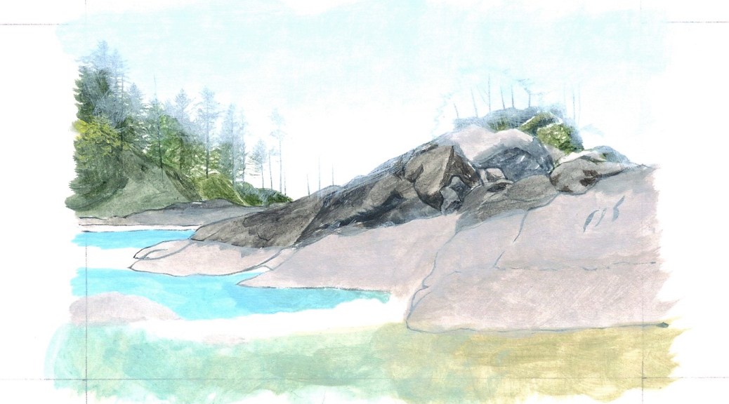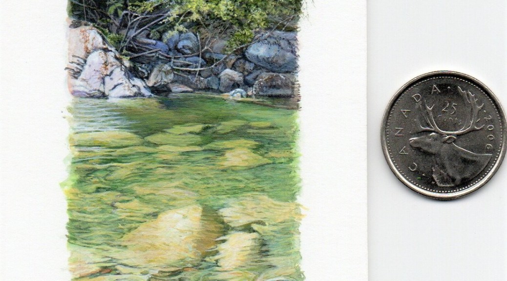 Newest tiny painting: “Swimming Hole” (1.5 x 4.5 inches), acrylic on artboard. A nice spot on a hot day, this is a lovely place to visit near Parksville BC.
