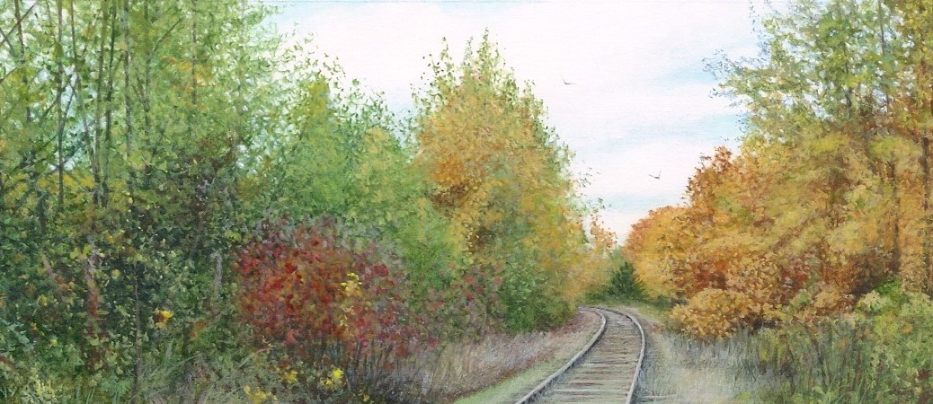Here’s a new miniature painting of some local train tracks disappearing into some lovely west coast autumn colour! This little painting is worked in acrylic on paper board.