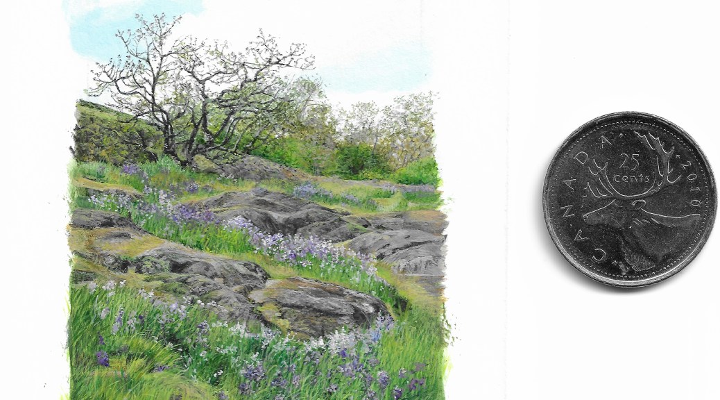 “Spring Meadow” (1.75 x 4.25 inches), acrylic on art board, second image with coin to show scale.