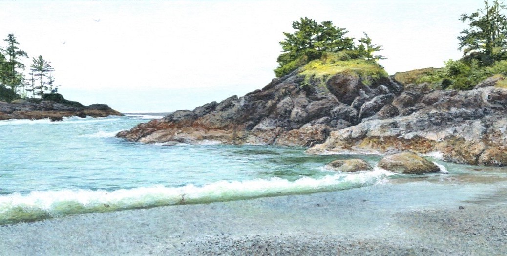 Here is another little piece from my summer series, titled: “When the Tide Rolls In” (1.75 x 4.25 inches small). This is a view from along the Wickaninnish beach area on the west coast of Vancouver Island.