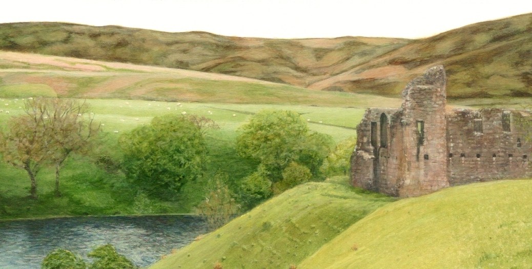 “The Ruined Keep” (a tiny 5.25 x 1.75 inches small). I discovered this old ruin (Morton Castle), slumbering peacefully along a back road in Scotland. The view was stunning and this silent ruin was great to walk through, a window into a different time. And yes, those are tiny sheep dotting the distant pasture.