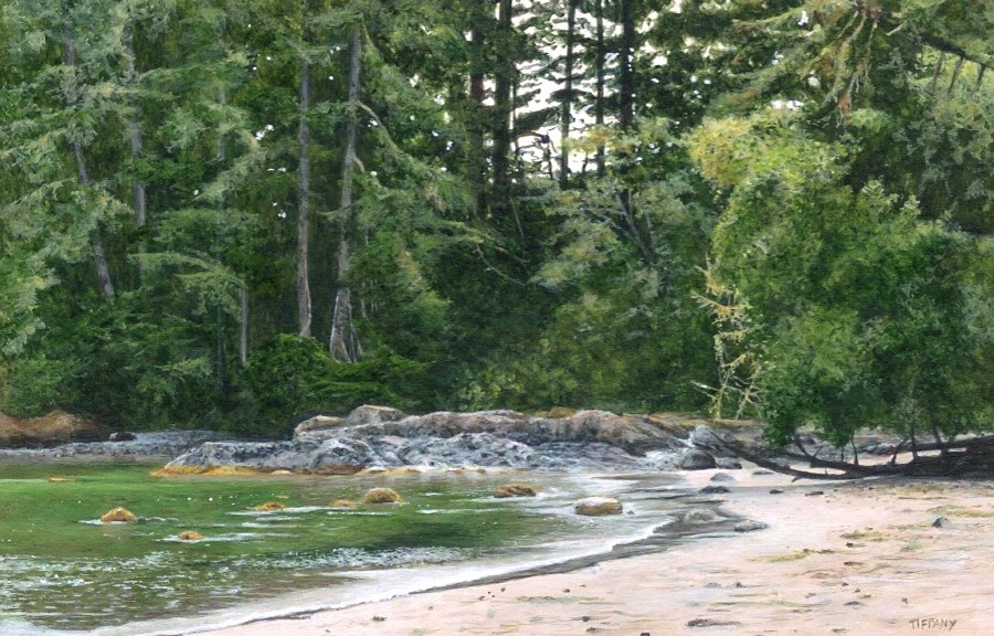 I painted this little miniature with memories of a lovely summer day spent on the beach near Tofino, BC. The dense green trees, sparkling water and warm golden sunshine made for a perfect west coast moment.